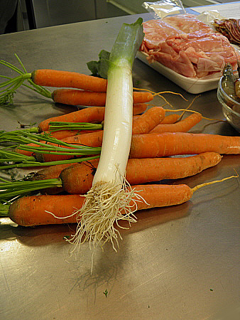 Sofregir els ossos fins que quedin rossets, remullar-los amb brandy i vi negre, i deixar reduir; retirar els ossos. Afegir-hi la ceba, el porro, el tomàquet i la pastanaga, i sofregir-ho.