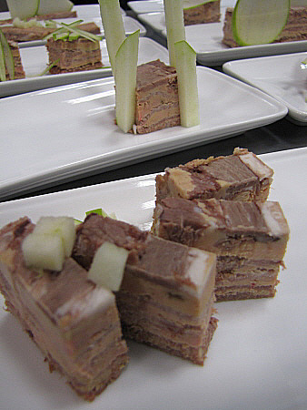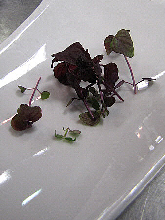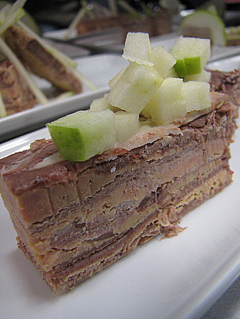 Llengua de vedella amb fetge d'ànec, vainilla, poma verda i brots