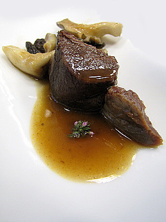 Per muntar el plat, call tallar el cilindres obtinguts de les galtes de vedella cuites, salsejar, i acompanyar amb els bolets tallats i saltejats a la paella.