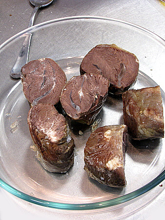 Netejar la galta de vedella. Un cop neta, donar-li forma cilíndrica amb paper film i paper d'alumini. Coure-la a 145º C durant dues hores, i reservar.