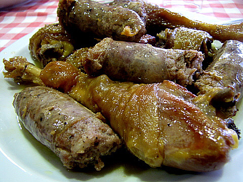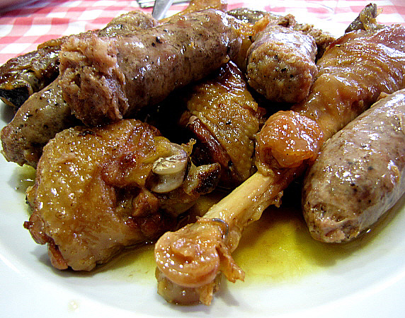 El rostit de cuixes de pollastre de pagès i botifarres El rostit de pollastre i botifarres és una menja de festa major, i també, en altres temps, d'ocasions especials com el segar i el batre. Jaume Fàbrega, a "El gust d'un poble: els plats més famosos de la cuina catalana" esmenta una cita de Verdaguer sobre la festa major, en el que evoca el seu plat preferit: "Al dinar surt lo millor anyel de la ramada i el més tendre pollastre del galliner".