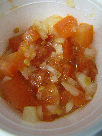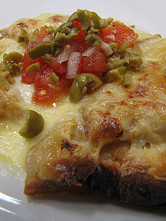 Quan s'hagi fos el formatge Oldenburguer, retirem del forn i posem al damunt la tepanada preparada amb el tomàquet i la ceba tallats a quarets, l'oli d'oliva i les olives, també tallades.