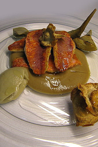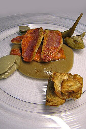 Coure els filets de roger amb una paella antiadherent, deixant-los al punt. Escalfem la crema, el puré i la gelatina, i saltem els quarts de cor de carxofa. Pelar una carxofa fins a obtenir el cor blanc i tendre, sense cap filament ni fulla exterior o tija. Tallar en petites tires i amanir amb oli d’oliva verge extra i sal. Disposem la crema de carxofes al centre del plat i al voltant les diferents textures de carxofa, ordenades de més tova a més cruixent (puré, gelatina, quarts saltats i xips). Col·loquem els filets de roger damunt la crema amb la pell cap amunt, i damunt d’aquests les tires de carxofa crua. Assaonem amb flor de sal i oli de carbó (fet amb oli de gira-sol i brases de carbó incandescents).