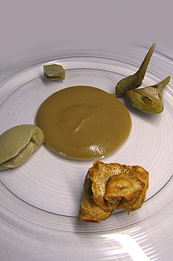 Pelem les carxofes, tallem a quarts i coem els cors amb aigua, sal i julivert, fins que siguin ben tendres. Reservem les fulles per la següent elaboració. Escorrem i reservem l’aigua de la cocció. En calent, triturem amb la mantega, l’oli d’oliva i una mica d’aigua de la cocció fins obtenir un puré fi i consistent. Posem a punt de sal i passem per un colador de malla fina.