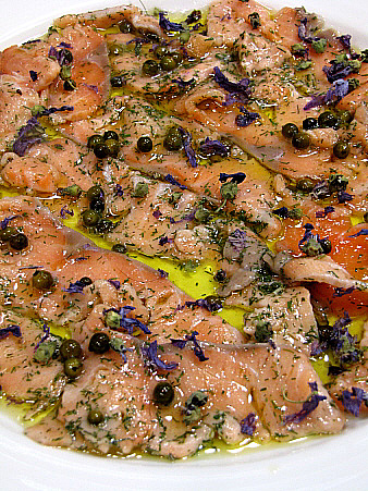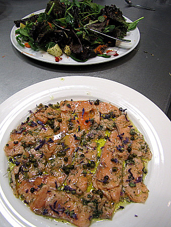 Descongelarem el salmó durant 1,5 hores a temperatura ambient. Ha de quedar més congelat que descongelat, així es podrà tallar més finament, amb aparença de carpaccio.