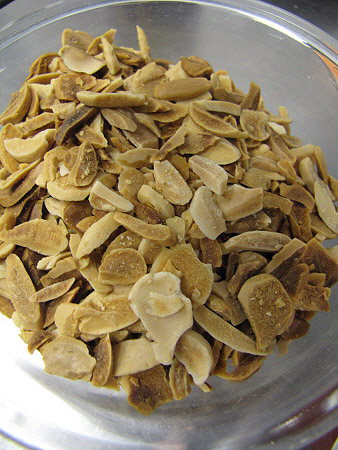 Saltegem en una paella amb mantega tota la fruita tallada a daus junt amb les làmines d'ametlla. Opcionalment hi afegirem vi dolç i canyella en pols.