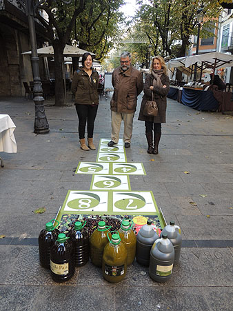 Presentació de l'oli nou de la DOP Oli de l'Empordà 2013 El dissabte 14 de desembre 2013 va tenir lloc a la Rambla de la Llibertat de Girona, la quarta edició de l'acte de presentació de l'oli nou organitzat per la Denominació d'Origen Protegida Oli de l'Empordà, amb la col·laboració de Girona Bons Fogons i el Gremi de Flequers. Per aquest motiu del 2 al 21 de desembre els restaurants adherits a aquest col·lectiu gastronòmic disposaran d'aquest oli a les seves taules. ![]() (Ampliar) - Components del grup gastronòmic Girona Bons Fogons a la presentació a la Rambla de la Llibertat de Girona. A més de tastar els olis dels trulls empordanesos, el públic va poder participar en un joc solidari a favor del Banc dels Aliments. La DOP Oli de l'Empordà ha destinat 100 litres d'oli al Banc dels Aliments mitjan&cceil;ant un joc de la xarranca en què els participants van haver de portar olives mentre jugaven. Simon Casanovas, president de la DOP, va preveure que la collita 2013 seria inferior a la de l'any anterior, en la que es van recollir prop de cinc milions de quilos d'olives, ja que durant la floració no va acompanyar el bon temps i també perquè les ventades varen malmetre una part de la collita. Malgrat això la qualitat de l'oli produït conserva una qualitat excel·lent. Reportatge de la presentaciķ. (Clicar damunt les imatges per ampliar-les) ![]() (Ampliar) - Xefs de restaurants que participen en la presentació.