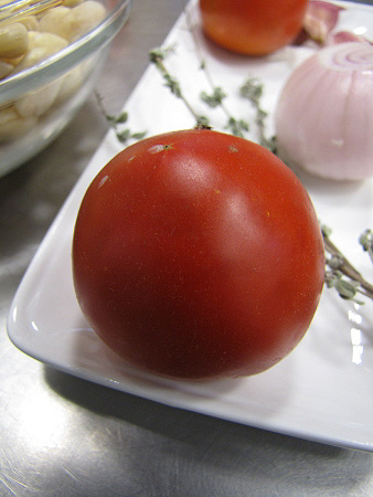Pelar i picar les ametlles. Picar ben petit la ceba, la pastanaga, i els gans d'all. Trirar el tomàquet pelat i sense llavors.