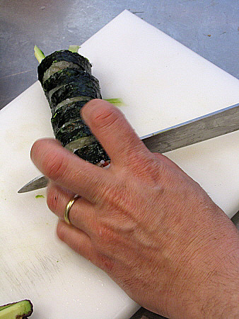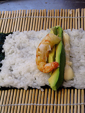 Preparació dels rotlles de llagostí i alvocat, i muntatge dels plats