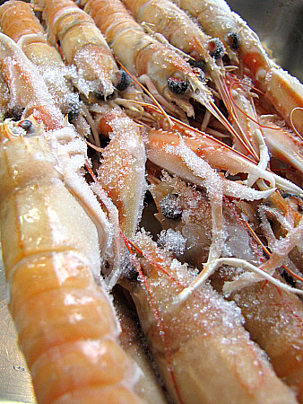 Per altra banda, netegem la sèpia, la tallem en tires i la congelem. Pelem els escamarlans i els reservem.