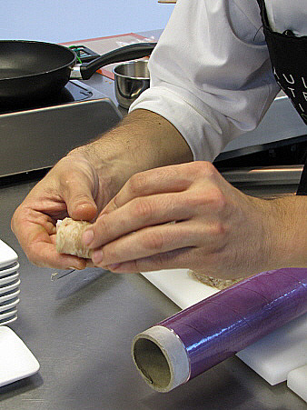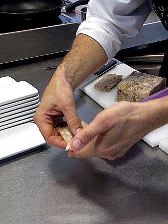 Terrina de peus de porc amb escamarlans i tallarines de sèpia
