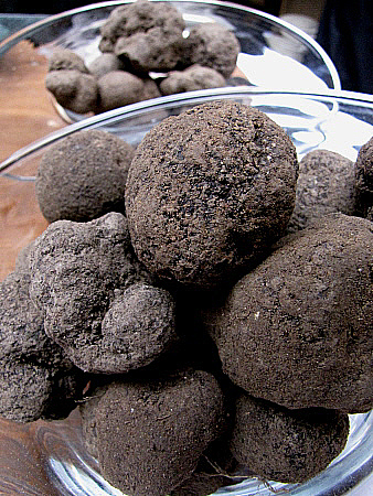 La tòfona negra o del Perigord (Tuber melanosporum), de color negrós o gris fosc amb tons violetes. Té forma irregular i s'assembla a un tros de carbó. La pell és mol fina i esta recoberta de berrugues. El seu cos és carnós i compacte, més blanquinós a prop de la pell i grisosa cap al centre fins convertir-se en un color marró violaci. Presenta un olor intens i picant i un sabor agradable, tot i que lleugerament amarg.