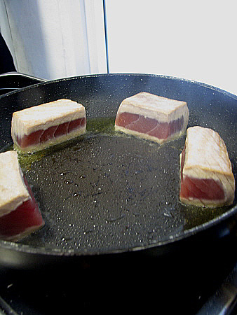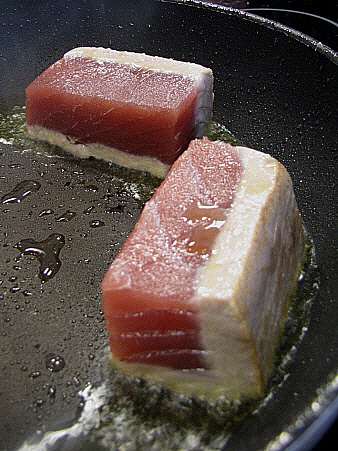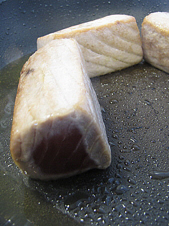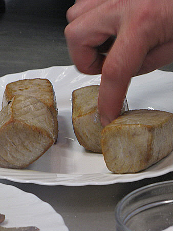 Tonyina a la planxa amb ceps, espàrrecs i crema de tomàquets dolça