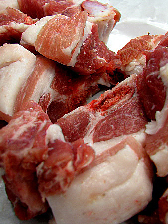 Saltejar les carcasses de pollastre amb oli verge junt amb la ceba fins a daurar. Retirar el greix i mullar amb aigua fins a cobrir. Portar a ebullició i coure a foc mitjà durant 35 minuts. Colar i coure la ventresca fresca dins d'aquest brou fins a completar la cocció. Retirar i reservar per separat el brou i la carn de porc.