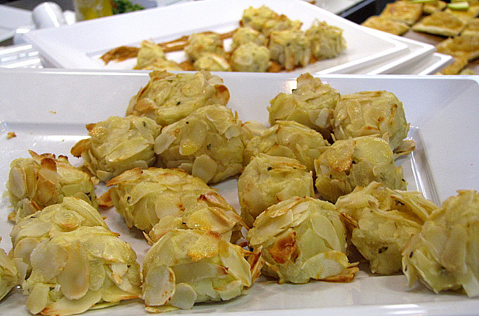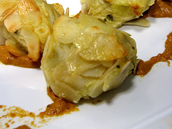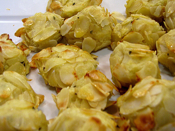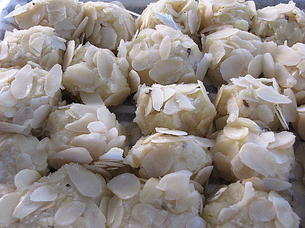 Fem un purè espès de patata, al que afegim el dos ous, les herbes i la nou moscada, i un cop fred, en fem boles. Les pintem amb ou, les arrebossem amb les làmines d'ametlla tallada, i les posem una estona al forn.