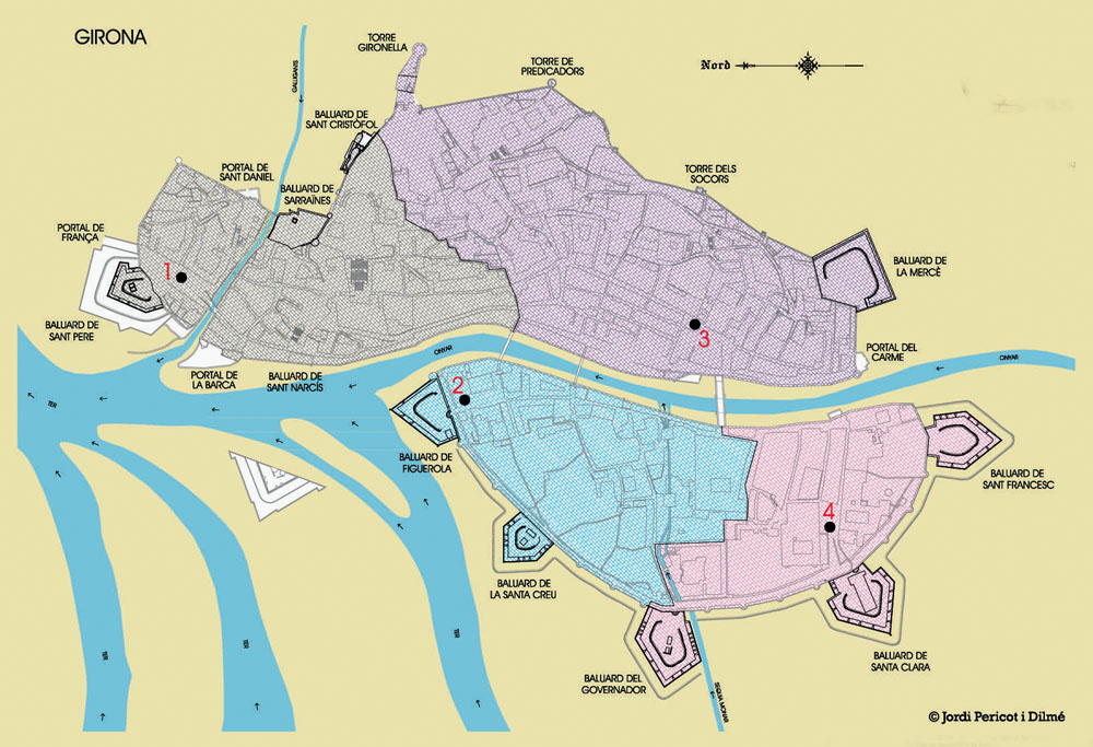 (Ampliar) - Destins i àrees de les quatre esquadres de la Companyia de Dones de Santa Bàrbara. 1 - Esquadra de Sant Narcís | 2 - Esquadra de Santa Eulàlia | 3 - Esquadra de Santa Dorotea | 4 - Esquadra de la Concepció. Plànol de Jordi Pericot i Dilmé.
