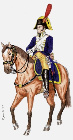 Cavalleria de Linia. Soldat del Regiment de Borbó. Dibuix de Fèlix Xunclà. Basat en "Uniformes Militares Españoles. El Ejército y la Armada en 1808", de José Maria Bueno, Málaga, 1982.