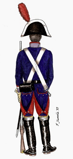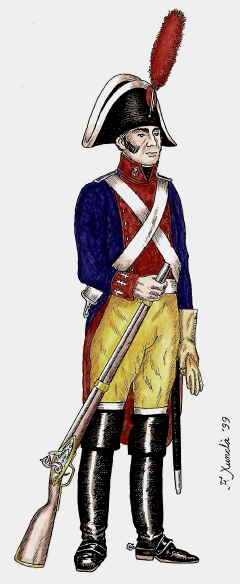 Cavalleria de Linia. Trompeta del Regiment de l'Infant. Dibuix de Fèlix Xunclà. Basat en "Uniformes Militares Españoles. El Ejército y la Armada en 1808", de José Maria Bueno, Málaga, 1982.
