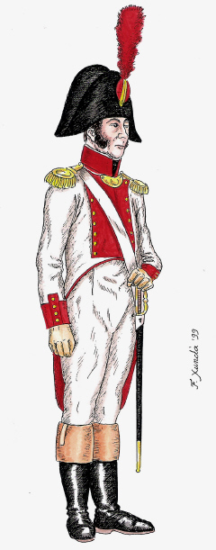 Milícies Provincials. Subtinent amb uniforme de gala. Dibuix de Fèlix Xunclà. Basat en "Uniformes Militares Españoles. El Ejército y la Armada en 1808", de José Maria Bueno, Málaga, 1982.