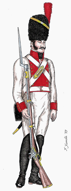 Milícies Provincials. Granader. Dibuix de Fèlix Xunclà. Basat en "Uniformes Militares Españoles. El Ejército y la Armada en 1808", de José Maria Bueno, Málaga, 1982.