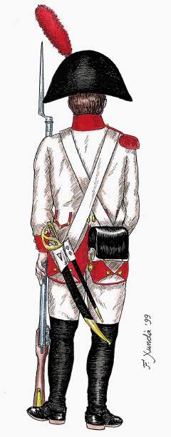 Milícies Provincials. Sergent de 2n de Fusellers. Dibuix de Fèlix Xunclà. Basat en "Uniformes Militares Españoles. El Ejército y la Armada en 1808", de José Maria Bueno, Málaga, 1982.