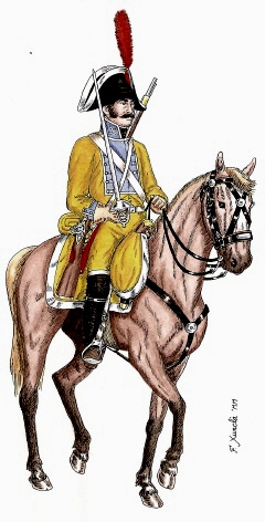 Dragó del Regiment Almansa. Dibuix de Fèlix Xunclà. Basat en "Uniformes Militares Españoles. El Ejército y la Armada en 1808", de José Maria Bueno, Málaga, 1982.