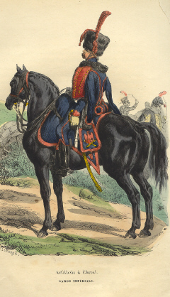 Artilleria a cavall. Guàrdia Imperial. Làmina de Bellange (1800-1866), extreta de l'obra de P.M. Laurent de L`Ardeche Histoire de Napoleon, 1843. (Wikipèdia)