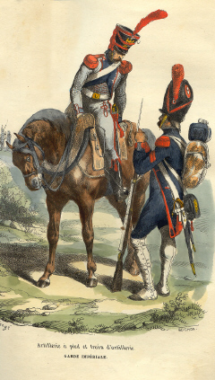 Artilleria a peu i tren d'artilleria. Guàrdia Imperial. Làmina de Bellange (1800-1866), extreta de l'obra de P.M. Laurent de L`Ardeche Histoire de Napoleon, 1843. (Wikipèdia)