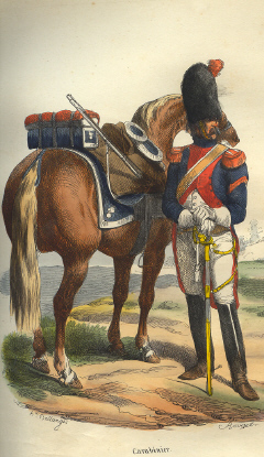 Dragó i Gastador de Dragons, 1809. Guàrdia Imperial. Làmina de Bellange (1800-1866), extreta de l'obra de P.M. Laurent de L`Ardeche Histoire de Napoleon, 1843. (Wikipèdia)