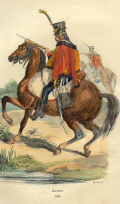 Húsar, 1809. Làmina de Bellange (1800-1866), extreta de l'obra de P.M. Laurent de L`Ardeche Histoire de Napoleon, 1843. (Wikipèdia)