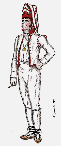 Infanteria de Línia. Granader amb uniforme de quarter. Dibuix de Fèlix Xunclà. Basat en "Uniformes Militares Españoles. El Ejército y la Armada en 1808", de José Maria Bueno, Málaga, 1982.
