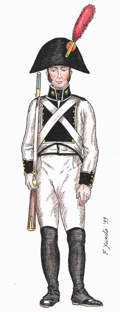 Infanteria de Línia. Fuseller del Regiment de Savoia. Dibuix de Fèlix Xunclà. Basat en "Uniformes Militares Españoles. El Ejército y la Armada en 1808", de José Maria Bueno, Málaga, 1982.