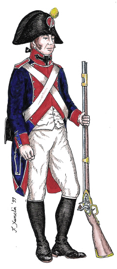 Infanteria de Línia Estrangera. Regiments suïssos. Regiment de Wimpffen nº 1. Dibuix de Fèlix Xunclà. Basat en "Uniformes Militares Españoles. El Ejército y la Armada en 1808", de José Maria Bueno, Màlaga, 1982.