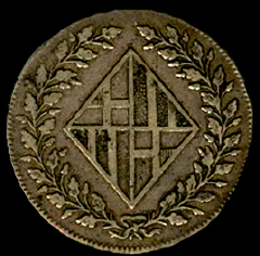 Moneda encunyada a Barcelona el 1808, durant la ocupació francesa. Anvers. (Wikipèdia)