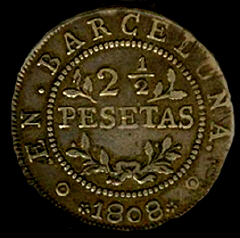 Moneda encunyada a Barcelona el 1808, durant la ocupació francesa. Revers. (Wikipèdia)