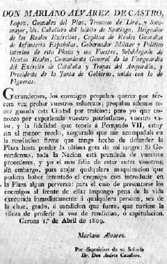 En el mismo día, á las dos en punto de la tarde, fingiendo una alarma mandó tocar generala y todo el mundo militares, paisanos y eclesiásticos empuñaron las armas y corrieron á ocupar sus sitios, disupuestos y hasta deseosos de recibir al enemigo. Álvarez montó á caballo, llevando en su sombrero una cinta roja colocada diagonalmente, en la que se leía en negros caracteres: Por Fernando 7º vencer ó morir. Recorrió todos los puntos de la plaza, fuertes, baluartes, murallas, retenes y demás, acompañado de su estado mayor, ayudantes de campo, el asesor, varios oficiales y una partida de caballeria del escuadrón de San Narciso. El pueblo y la guarnición comprendieron instintivamente que aquel era el jefe que ellos necesitaban y á los gritos entusiastos de viva Fernando séptimo, y viva el Comandante general, se estableció entre Álvarez y Gerona una alianza tácita, que fue la que permitió llevar á cabo la gran defensa que motiva el presente trabajo, alianza que aun dura, aunque no sea ya sinó por el respeto y cariño con que se conserva su recuerdo. Alvarez comprendió el escelente efecto que había producido y la confianza que desde aquel momento inspiraba, y para completarla, para satisfacer los deseos de los gerundenses, cuyo entusiasmo es inesplicable, publicó el siguiente bando: "Don Mariano Alvarez de Castro, Lopez, Gonzalez del Pino, Troncoso de Lira, y Soto Mayor, etc. Caballero del Hábito de Santiago, Brigadier de los Reales Exercitos, Capitan de Reales Guardias de Infanteria Españolas, Gobernador Militar y Político interino de esta Plaza y sus Fuertes, Subdelegado de Rentas Reales, Comandante general de la Vanguardia del Exército de Cataluña y tropas del Ampurdan, y Presidente de la Junta de Gobierno, unida con la de Figueras. "Gerundenses, los enemigos propalan querer por tercera vez probar vuestros esfuerzos; propalan ademas tener ganada esta Ciudad por traicion; pero yo que conozco por esperiencia vuestro patriotismo, vuestro valor, y la fidelidad que tenéis á Fernando VII, estoy sin el menor recelo, asegurado que me acompañais en la resolucion firme que tengo hecha de defender la Plaza hasta perder la ultima gota de mi sangre: Sí, Gerundenses, toda la Nacion esta prendada de vuestros procederes, y yo el mas feliz de estar entre vosotros; sin embargo, para atajar cualesquiera maquinacion que pudiera haber inventado el enemigo con introducir en la Plaza algun perverso: para el caso de presentarse los enemigos al frente de ella: impongo pena de vida executada inmediatamente á qualquiera persona, sea de la clase, grado, ó condicion que fuere, que tuviese la vileza de proferir la voz de rendicion, ó capitulacion. "Gerona 1º de Abril de 1809.-- Mariano Alvarez.-- Por disposicion de su Señoria.-- Dr. D. Andres Cavallero". Publicóse y fijóse en las esquinas este bando por el mismo asesor secretario acompañado del Sargento Mayor de la plaza el teniente coronel D. Juan Molinas, escoltados por varios piquetes de granaderos y partidas de tropas, entre los acordes de las músicas de los regimientos de Ultonia y Borbón, y á los gritos de viva Fernando 7º que proferia una estraordinaria y entusiasmada muchedumbre que seguía á la comitiva oficial y aplaudía el bando á cada lectura. Pasando ahora á otro asunto debemos consignar, para seguir el orden de fechas, que el Secretario de la Junta de Gobierno, D. Miguel Germen fue jubilado, y en consecuencia en 5 de Abril fue nombrado en su reemplazo D. Francisco Puig y Dorca con el haber de doce reales diarios. D. Francisco Puig y Dorca fue uno de los que en el seno de la junta gubernativa mas contribuyeron á la defensa de Gerona, como se consigna en la certificacion que se le expidió de sus méritos y servicios y cuya copia es como sigue: "Nos la Junta de Observación y Defensa de la Ciudad y Corregimiento de Gerona, residente en la villa de Canet de Mar. "Certificamos: que D. Francisco Puig y Dorca, natural de dicha Ciudad, teniente del primer tercio de Cataluña, creado en la anterior guerra contra la Francia, y notario real y publico del numero y Colegio de la misma Ciudad, el dia 5 de junio de 1808 fue elegido por los Colegios, gremios y parroquias de la referida Ciudad, para exponer á su Gobernador y Ayuntamiento la necesidad que había de ponerla en defensa, en ocasión en que había una numerosa división francesa en la ciudad de Mataró y otra en la villa de Figueras, lo que ejecutó con emocion y energia en el mismo dia ante dicho Ayuntamiento, presidido por el gobernador, de que resultó la Junta de Gobierno que se instaló al mismo día y fue de ella elegido vocal el dicho D. Francisco Puig y Dorca: quien con su celo y procedencia cooperó á que no se derramara una gota de sangre en los días de la revolución, cuyo torrente impetuoso no paró hasta que el trabajo de poner corriente, en lo posible, la fortificacion de la ciudad; tuvo ocupados los vecinos y los forasteros que acudían á tropel; y el día 20 del mismo mes, recorriendo los baluartes y murallas con valor y entusiasmo, procuró no faltasen las municiones necesarias, y fue uno de los que contribuyó á rechazar al enemigo, que atacó y asaltó la ciudad con obstinación inaudita: con igual valor y entusiasmo se portó en el sitio y bombardeo de julio y agosto del mismo año, y en el momento mismo que el enemigo levantó el cerco y huyó precipitadamente, lo comisionó la Junta para que, auxiliado de una partida de tropa pasase á los campamentos de Sarriá, en donde había dexado la division del general Reylle una multitud de efectos de boca y guerra, lo que executó sin perder instante, y permaneció en aquellos campamentos ocho días, para recoger y hacer conducir dentro la ciudad lo que el enemigo había dexado, que era cosa de consideración. Despues, en virtud de una orden circular de la Junta Superior del Principado, le nombró este corregimiento habilitado para percibir caudales de la Hacienda del Exercito, á cuyo efec