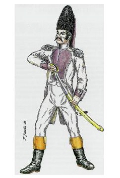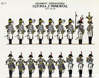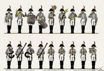 Uniformes de la Guerra del Francès a Girona. Esquerra: Reg. Granada d'infanteria de linia. Sergent major amb uniforme de gala (1805-1811). Dreta: Regiment Sòria d'infanteria de linia. Capità de granaders amb uniforme de campanya (1805-1811). Dibuixos de Fèlix Xunclà publicats al Butlletí nº 5 de "El Baluard", 1999.