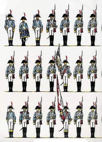 Làmina amb uniformes del regiment Ultònia. Tropa amb banderes reglamentària i tradicional. Dibuix: Joaquim Pla i Dalmau. Col·lecció particular, Girona.