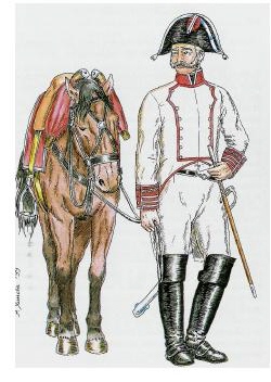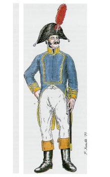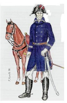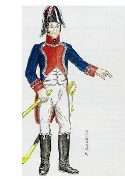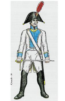 Uniformes de la Guerra del Francès a Girona. Esquerra: Reg. d'Infanteria de Borbó. Coronel amb uniforme de campanya (Brigadier Comte de Caldagués, 1808). Dreta: Regiment d'infanteria d'Ultònia. Coronel amb uniforme de diari (1808-1814). Dibuixos de Fèlix Xunclà publicats al Butlletí nº 5 de "El Baluard", 1999.