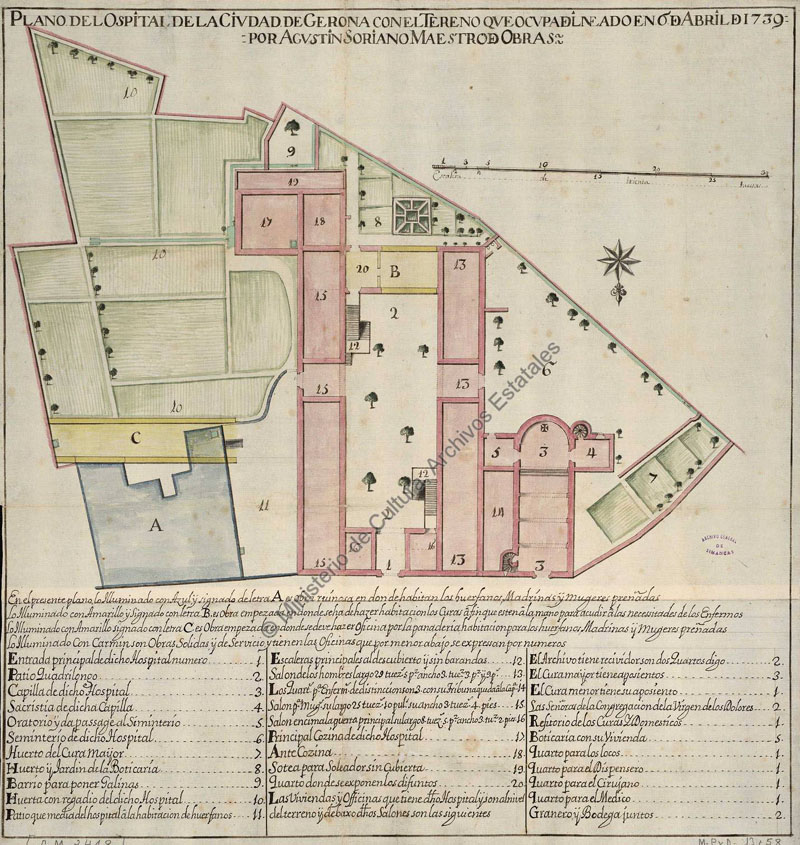 (Ampliar) - Plano del Ospital de la Ciudad de Gerona con el Tereno que ocupa delineado en 6 de abril de 1739 por Agustín Soriano, maestro de Obras. Archivo General de Simancas.