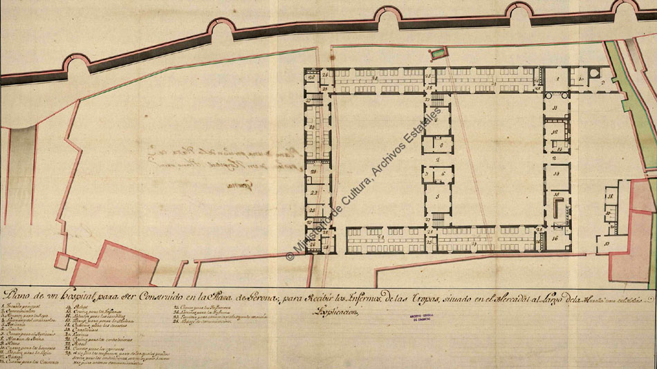 (Ampliar) - Plano de un hospital para ser construido en la plaza de Gerona para recibir los enfermos de las tropas, situado en el Mercadal al largo de la muralla, cerca del Molino. 1749. Mai va ser construït. Archivo General de Simancas. Secretaría de Guerra.