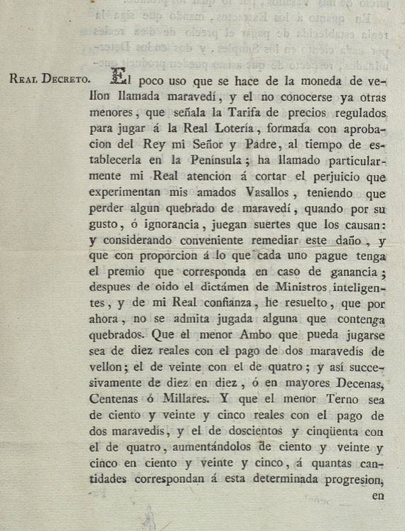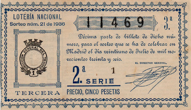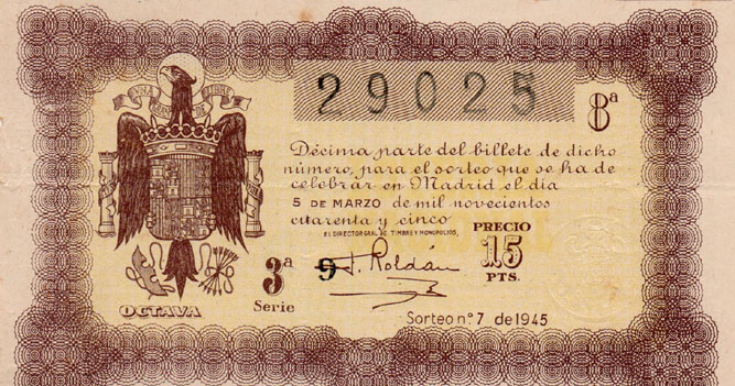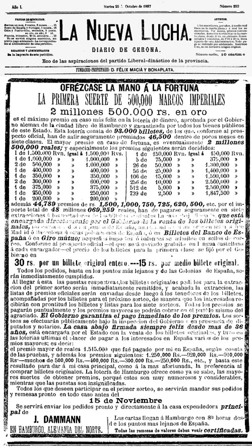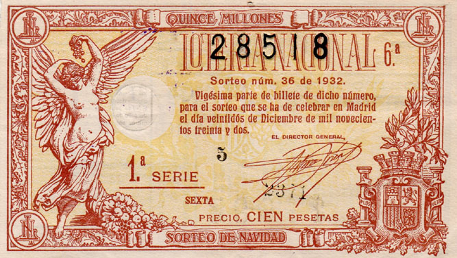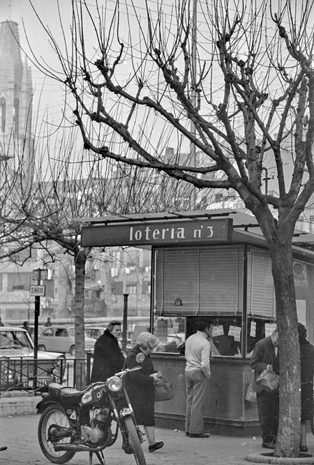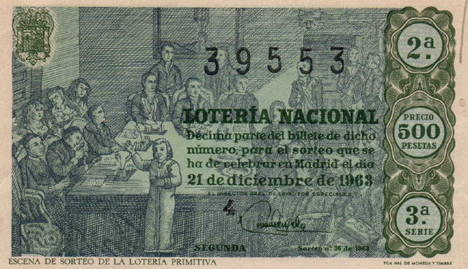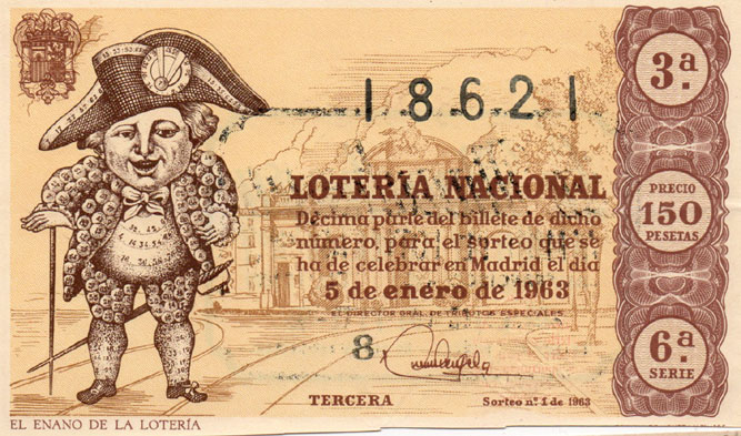 Els primers venedors ambulants de bitllets de loteria que hi hagué a la ciutat va ser cap a 1870, un vellet que era tan curt de vista que la gent l'anomenava "el ceguet" (J. Gibert). El 1879 es construí un quiosc de fusta a l'anomenat "pati dels esparters", a la part alta de la plaça de les Cols, l'actual Rambla de la Llibertat, amb l'exclusiu objecte de vendre bitllets de les rifes de Madrid i de les que encara es seguien fent a Barcelona. L'any 1880 es venien bitllets de la "Nacional", del "Pardo", del "Niño", d'"Aranjuez", de la Caritat, de l'Hospital, dels Pobres, de la Beneficència i de la Municipal, totes forasteres. ![]() (Ampliar) - Número de la 'Loteria Nacional' del 22 de desembre de 1932. Gentilesa de l'Arxiu Xavier Romero de Cassà de la Selva. A finals del segle XIX i la primera meitat del segle XX, i des de 1881, quan per Reial Decret es va instituir la Loteria Nacional (tot i que pròpiament, la "Loteria" amb caràcter de recurs normal i permanent, va començar a Espanya l'any 1763, en temps del rei Carles III), els gironins estaven tot el matí pendents de les noves telegràfiques que comunicaven els resultats de la rifa que es celebrava a la "Casa de la Moneda" de Madrid, els primers premis de la qual apuntaven als vidres exteriors dels locals més centrics, generalment cafès, davant els quals es congregaven bon nombre de persones que després anaven a escampar per la ciutat els números premiats. Durant el matí no es parlava d'altra cosa. La major part de les famílies gironines jugaven "participacions" o "apuntacions", com se'n deien, que d'un ral en amunt havien adquirit a les botigues i establiments que acostumaven a freqüentar durant l'any. A Girona no hi ha caigut mai la "grossa" de la "Loteria Nacional". ![]() (Ampliar) - Dècim de la 'Loteria Nacional' del 21 de desembre de 1963, amb un gravat d'una escena dels sorteig de la 'Loteria Primitiva'. Gentilesa de l'Arxiu Xavier Romero de Cassà de la Selva. L'arribada de la 'Loteria Nacional'. El primer sorteig de la Loteria Nacional espanyola es va celebrar el 10 de desembre del 1763 a la plaça de San Ildefonso de Madrid, rifa proposada per Leopoldo de Gregorio, marquès d'Esquilache al rei Carles III, tot seguint la pauta del joc que ja es venia realitzant a la cort de Nàpols, amb la contractació d'un director italià per posar en marxa a la península la Lotto, que era igual que la que ara s'anomena Loteria Primitiva. Aquesta lotería era beneficonta, per dedicar els recursos a la beneficència. ![]() (Ampliar) - Dècim de la 'Loteria Nacional' del 21 de juliol de 1936. Gentilesa de l'Arxiu Xavier Romero de Cassà de la Selva. La loteria moderna va néixer el 1811, per iniciativa de Ciriaco González Carvajal, amb l'objectiu d'aportar fons a la Hisenda Pública, que havia quedat ressentida per la Guerra del Francès. El primer sorteig va tenir lloc a Càdis, el 4 de març del 1812 (4), concebuda com "un medio de aumentar los ingresos del erario público sin quebranto de los contribuyentes". Circumscrita en principi a Càdis i San Fernando, saltà després a Ceuta i a tot Andalusia, a mesura que avençava la retirada dels exèrcits napoleònics. El 28 de febrer del 1814 se celebrà el primer sorteig a Madrid, des d'aleshores la seu de la "Lotería Nacional de billetes" (5). ![]() (Ampliar) - Dècim de la 'Loteria Nacional' del 5 de gener de 1963, amb un gravat del 'Nan de la Loteria'. Gentilesa de l'Arxiu Xavier Romero de Cassà de la Selva. El 27 de gener de 1862 se suprimí el sistema antic o Lotto, i l'any 1888 tingueren lloc diverses rifes pel sistema d'irradiació, que consisteix en formar un número de cinc xifres extretes de cinc globus que havien de contenir les unitats, desenes, centenars, milers i desenes de miler; el 1924 s´instal·laren els actuals bombos. Durant la Guerra Civil, ambdues zones en conflicte organitzaren les seves pròpies rifes. El 13 d´octubre del 1962 es va celebrar la primera edició pel sistema de bombos múltiples. Els bitllets de loteria han presentat diverses mides: ja a l'època moderna, a partir del 1900, format gran fins al 1963; mitjà fins al 1966; i el petit o actual, d'ençà de l´any 1967 (X. Romero). ![]() (Ampliar) - Dècim de la 'Loteria Nacional' del 5 de març de 1945. Gentilesa de l'Arxiu Xavier Romero de Cassà de la Selva. Una rifa especial: la insaculació.
