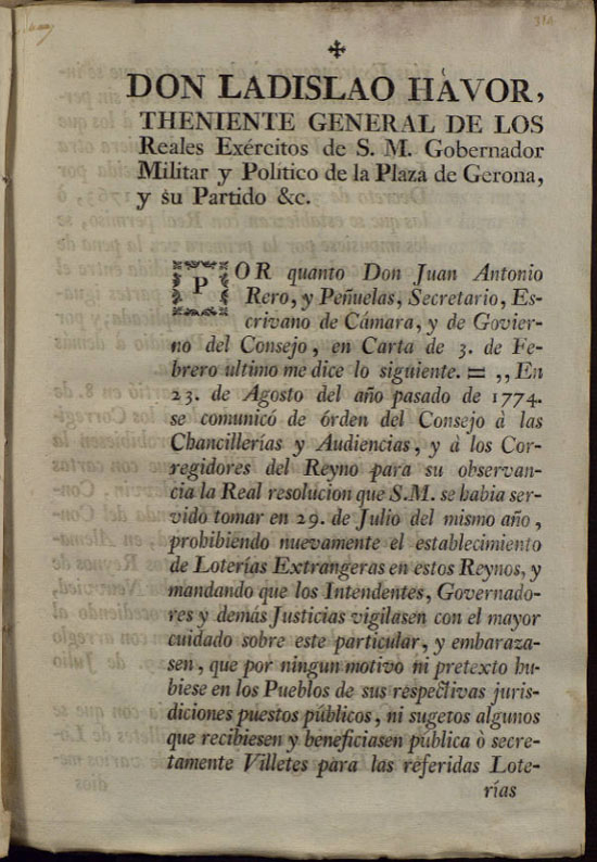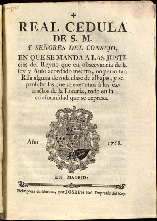 ![]() (Ampliar) - Número de la rifa mensual que es feia a Girona amb un premi de mil rals. Ca. 1835. Publicat per J. Gibert. ![]() (Ampliar) - Circular del governador de Girona, Don Ladislao Hávor, sobre la prohibició de l'establiment de loteries estrangeres. 1787, Girona. Arxiu Històric de Girona. ![]() (Ampliar) - Real cedula de S.M. y señores del Consejo en que se manda a las justicias del reyno... no permitan rifa alguna de toda clase de alhajas y se prohibe las que se executan à los extractos de la loteria... [don Carlos... rey de Castilla...]. En Madrid, reimpresa en Gerona por Joseph Bró, 1788. Arxiu Històric de Girona. ![]() (Ampliar) - Real decreto. El poco uso que se hace de la moneda de vellon llamada maravedí, y el no conocerse ya otras menores... ha llamado particularmente mi real atencion... [Julian Martinez de Torres]. Reial decret sobre les monedes vàlides per a jugar a la loteria. Madrid, 1792. Arxiu Històric de Girona. ![]() (Ampliar) - Aviso al público. Instrucción de la loteria nacional de España que ha de establecerse en Cádiz. 1812. Universitat Pompeu Fabra. ![]() (Ampliar) - Estado de cargo y data de caudales de la tesorería de la Lotería Nacional de mi cargo comprehensivo de los doce sorteos que se han celebrado en esta plaza en el año próximo pasado de mil ochocientos doce. Cádiz, 1813. Universitat Pompeu Fabra. ![]() (Ampliar) - Resultat del sorteig de la Loteria de l'11 d'octubre de 1841 publicat al diari gironí 'El Postillón'. ![]() (Ampliar) - Anunci de loteria hamburguesa publicat al diari gironí 'La Nueva Lucha' el 25/10/1887. ![]() (Ampliar) - Venda de loteria de Nadal a l'administració de la plaça Independència. 1970. Narcís Sans Prats. CRDI - Ajuntament de Girona. ![]() (Ampliar) - 29 de desembre de 1436. La reina Maria, esposa i lloctinent del rei Alfons IV, als jurats, Consell i prohoms de la ciutat de Girona. Els mana que l’elecció dels oficials de la ciutat es faci segons l’incipient procediment de la insaculació duplicant el nombre de candidats, per tal d’evitar els abusos comesos en eleccions anteriors. Arxiu Municipal de Girona. ![]() (Ampliar) - Bossa d'insaculació. Museu d'Història de Girona. ![]() (Ampliar) - Llibre de matrícula dels insaculats. S'hi anoten les persones insaculades per a diferents càrrecs i oficis de la ciutat. 1458-1626. Arxiu Municipal de Girona. ![]() (Ampliar) - Llibre de matrícula dels insaculats. S'hi anoten les persones insaculades per a diferents càrrecs i oficis de la ciutat. 1626-1713. Arxiu Municipal de Girona. ![]() (Ampliar) - 17/12/1687. El lloctinent Diego Felípez de Guzmán, marquès de Leganés, als jurats de la ciutat de Girona. Atès que per diversos privilegis reials hi ha assenyalats dos llocs a les bosses de jurats per als doctors en medicina, els encarrega que tractin aquest afer de manera que satisfacin la petició del Col·legi de Metges i quedi establerta, així, la insaculació. Lletres Reials. Arxiu Municipal de Girona. |
