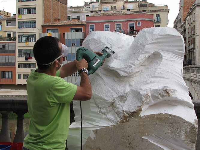 Pau Morales realitzant una escultura al Pont de Pedra |