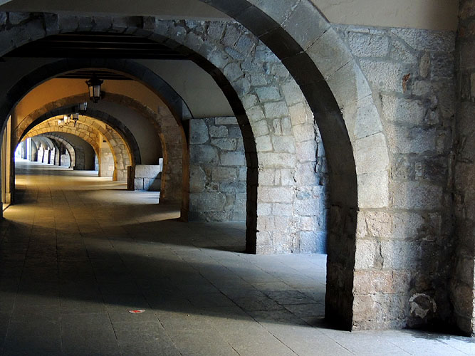 El segle XII l'actual Rambla era la prolongació cap els arenys del riu Onyar de la plaça del mercat. En urbanitzar-se la zona, les primeres cases arribaren a la línia interior de la Rambla, ja a finals del XII. Durant els primers anys del XIII, es va construir un mur de contenció que protegia el nou barri de les escomeses de l'Onyar. El batlle reial va començar a atorgar llicències per construir sobre el carrer que passava entre les façanes i el mur de contenció (entre 1203 i 1252). Per assegurar la lliure circulació per la via pública, els veïns havien d'aixecar els pilars propis fonamentats en el mur i, per damunt, els arcs que havien de suportar les ampliacions de les cases bastides sobre el carrer. Aquest és l'origen de les voltes de la Rambla. Els diversos trams tenien diferents noms, basats en oficis i comerços: les voltes dels Esparters, les de la Merceria...