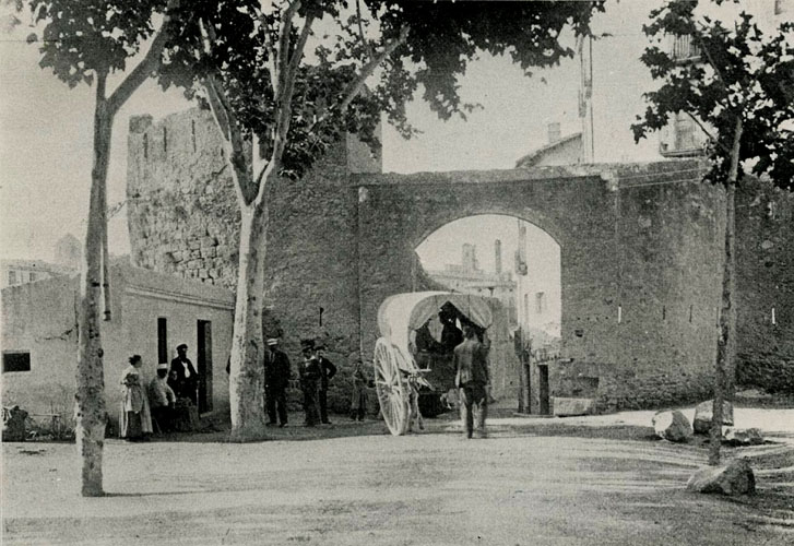 (Ampliar) - La torre i el portal del Carme, accés principal de la muralla sud. La infraestructura defensiva va ser utilitzada a principis del segle XX per al control dels productes comercials que portaven a terme els burots, situats en els punts principals d'accés a la ciutat. Amadeu Mauri, 1900. CRDI - Ajuntament de Girona.