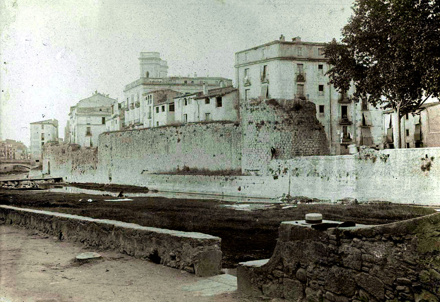 (Ampliar) - Tram de muralla del riu a l'altura del Portal del Carme. Al fons a l'esquerra, el portal de l'Àngel i la palanca d'en Vila. 1901-1902. Amis Unal d'Ala. CRDI - Ajuntament de Girona.