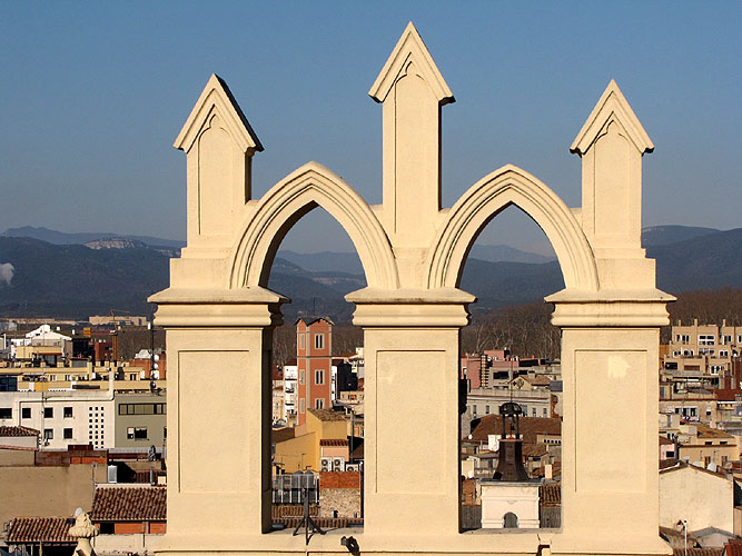 (Ampliar) - Espadanya del centre Maria Gay. A través de l'ull esquerra, s'observa la torre de les AigÜes, i del dret, el campanar de l'Ajuntament.