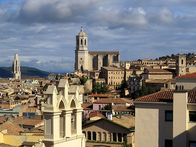 (Ampliar) - Vista dels teulats de Girona des del tram de muralla. En primer terme, el centre Maria Gay, i al fons, Sant Feliu i la Catedral.