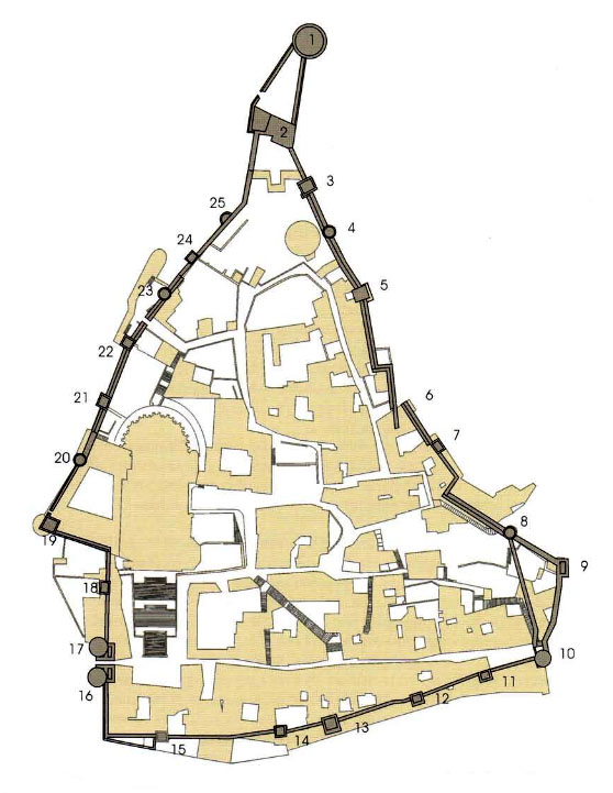 pany meridional de la Força Vella (sector del pati de Les Àligues, plaça Sant Domènec,..) i amb el llenç més modern de muralla que circula vers el sud, cap a! convent de Sant Domènec i Portal Nou.